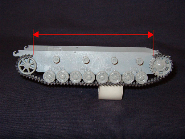 También es conveniente fijar la oruga a las ruedas con pegamento, preferiblemente con pequeñas gotas de cianocrilato depositadas por la parte posterior a lo que vemos de perfil. Una vez fijado continuamos con el proceso anterior de doblado del tramo, hasta llevar el extremo a la tensora, donde es recomendable fijar también el extremo del tramo con pegamento de forma que no se vea la unión.